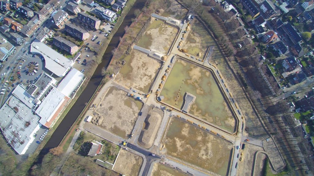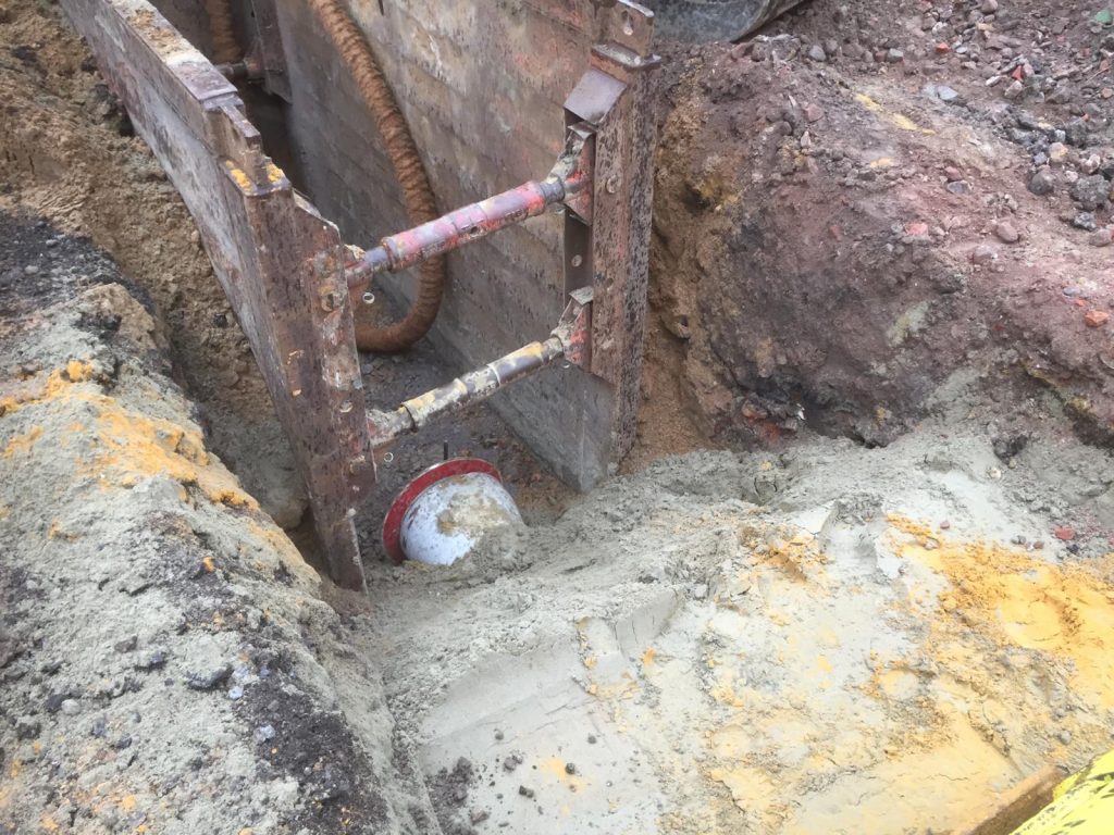 Derzeit erstellen wir das Regenrückhaltebecken (RRB) am Weber Quartier, in Bocholt. Es entsteht ein unterirdisches RRB. Die Aufgabe eines RRB ist, eine große Wassermenge aufzunehmen und über eine Rohrdrossel, langsam dem Gewässer, der alten Aa, zu dosieren. Auf diese Weise gibt es keine Spülstöße, die der Gewässerfauna schaden könnten.
