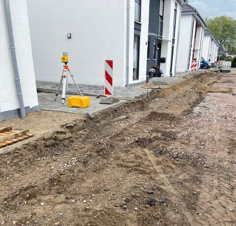 Heute starten auch unsere Bauarbeiten in Oberhausen, am Bauvorhaben “Biefang“ Schwarzer Heideweg. Zunächst erledigen wir Vorarbeiten, zur Setzung der Randsteine.